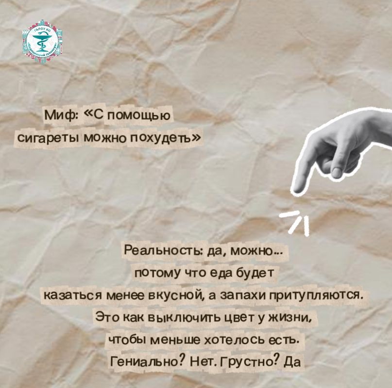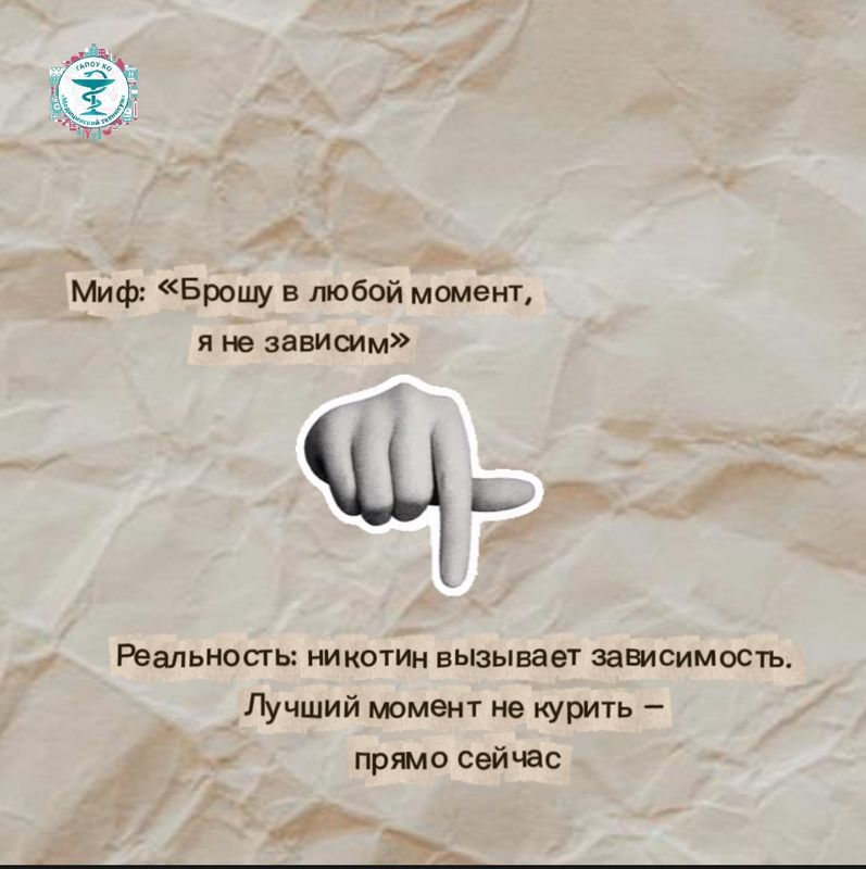 · Реальность: Никотин вызывает зависимость. Мозг обманывает сам себя, говоря это. Лучший момент не курить — прямо сейчас.
