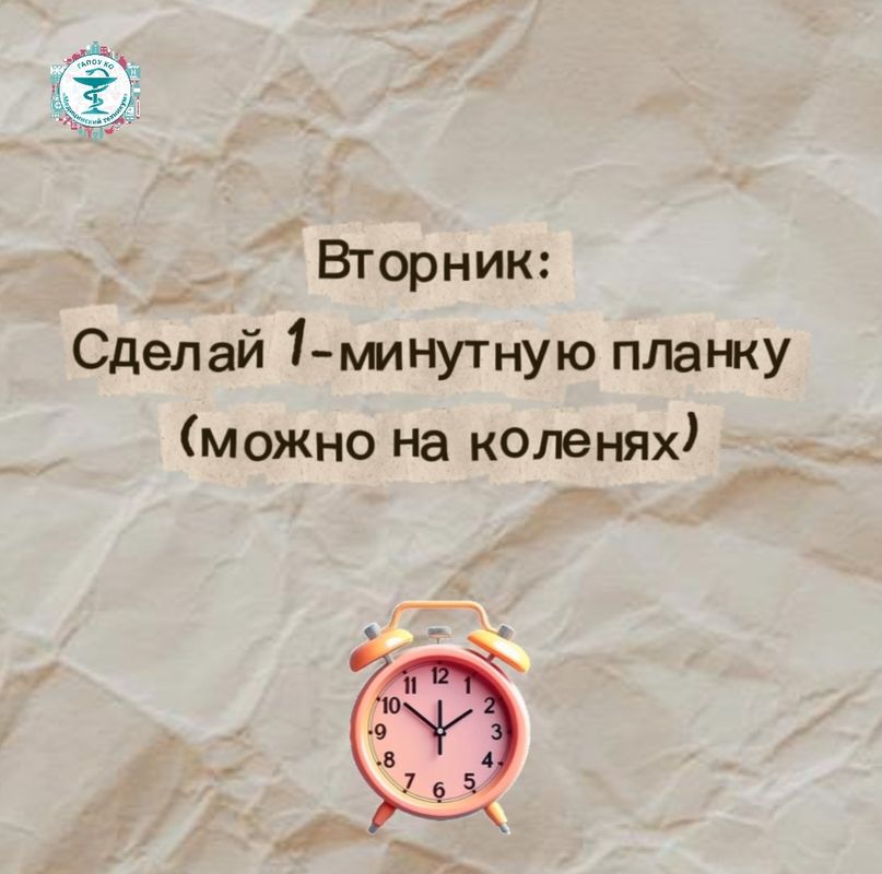 - Вторник: Сделай 1-минутную планку (можно на коленях)