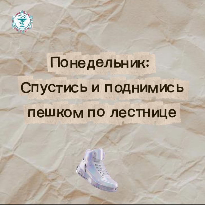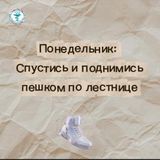 - Понедельник: Спустись и поднимись пешком по лестнице на 3 этажа