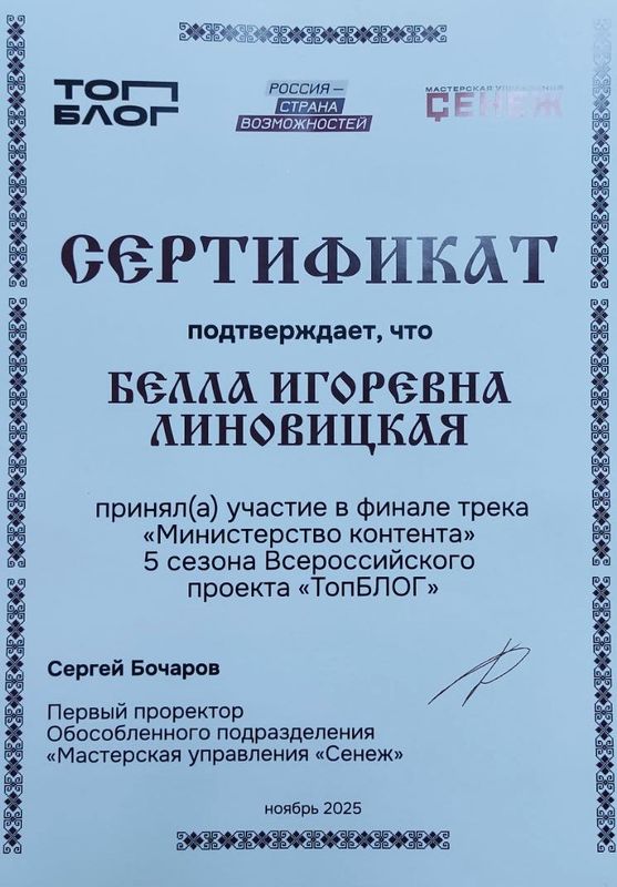 2025 год – финалист трека «Министерство контента» 5 сезона Всероссийского проекта «ТопБЛОГ»