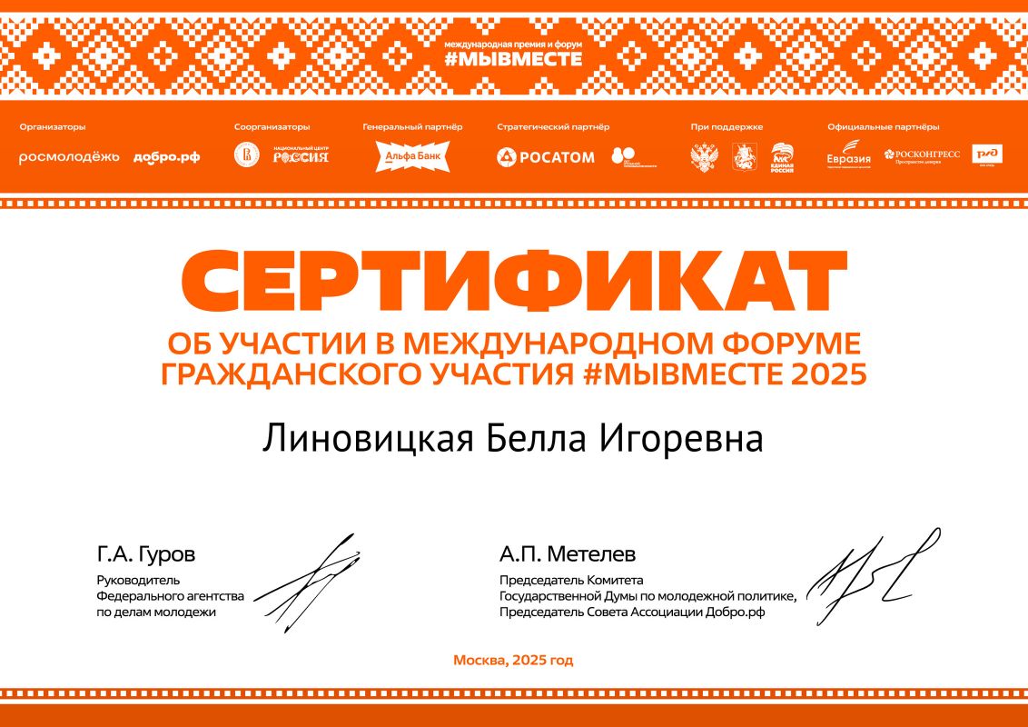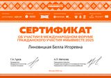2025 год – сертификат об участии в международном форуме гражданского участия #МЫВМЕСТЕ 2025, участник регионального этапа