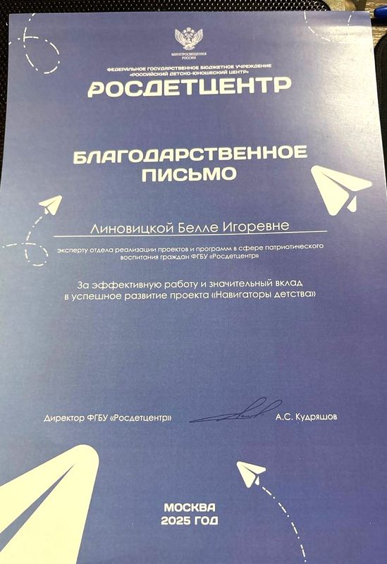 2025 год – благодарственное письмо от директора ФГБУ «Росдетцентр» А.С. Кудряшова за эффективную работу и значительный вклад в успешное развитие проекта «Навигаторы детства»
